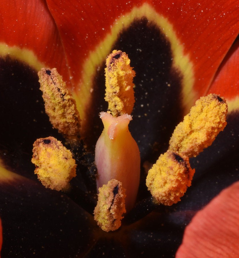 Filamente kahl, am Grund kaum erweitert, schwarzbraun, Antheren 10 - 16 mm lang, schwarzviolett, Fruchtknoten gelbgrün, Narben rosa gelb oder hellgrün