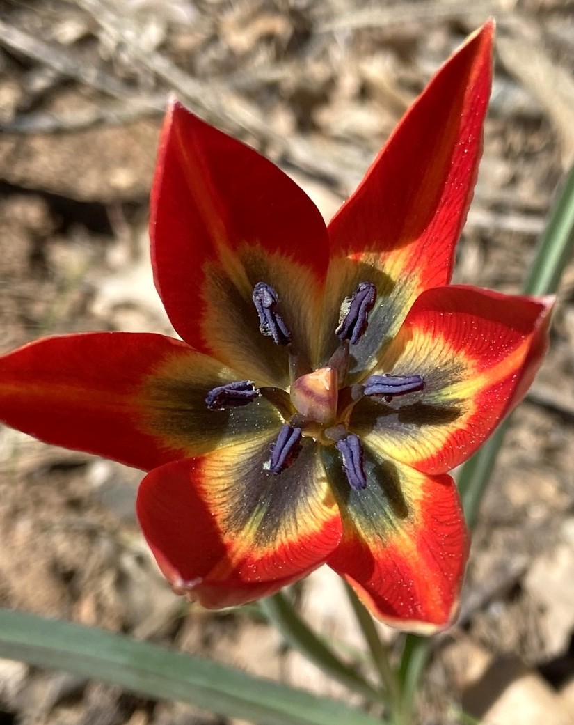 Blüten rot oder orangerot, am Grund mit grauviolettem Fleck, der undeutliche gelbe Ränder aufweist, 6 Perigonblätter, 6 Staubblätter, 1 oberständiger Fruchtknoten, Filamente bräunlich, Antheren schwarzviolett