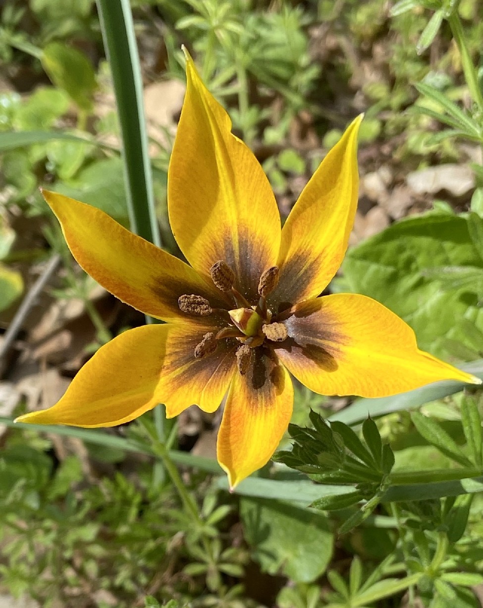 6 Perigonblätter, 6 Staubblätter, 1 oberständiger Fruchtknoten, Antheren stumpf braunviolett Perigon am Grund mit grauviolettem Fleck, der undeutliche gelbe Ränder aufweist, Filamente bräunlich, an der Spitze verschmälert, gelblich