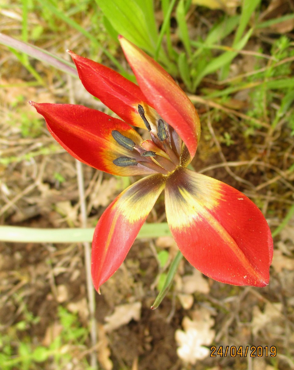 Blüten scharlachrot, am Grund mit grauviolettem Fleck, der undeutliche gelbe Ränder aufweist, Perigonblätter spitz, schlank, am Grund verschmälert, 6 Perigonblätter, 6 Staubblätter, 1 oberständiger Fruchtknoten,
