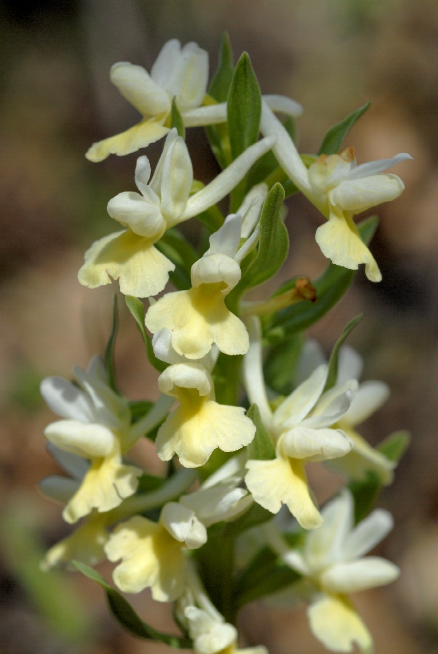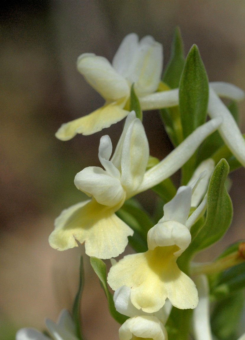 Blüten ohne Schleifenmuster, weißlich gelb mit einer etwas dunkleren gelb bis grünlichen Verfärbung am Ansatz der Lippe, Lippe 5 - 7 mm lang, 7 - 9 mm breit, meist seitlich umgebogen, Sporn 6 - 8 mm lang, abwärts gebogen, Pollinien gelb