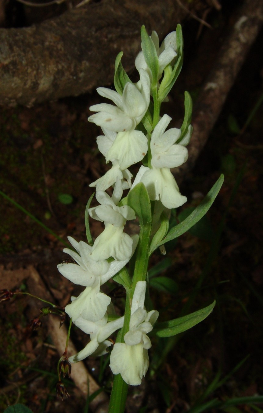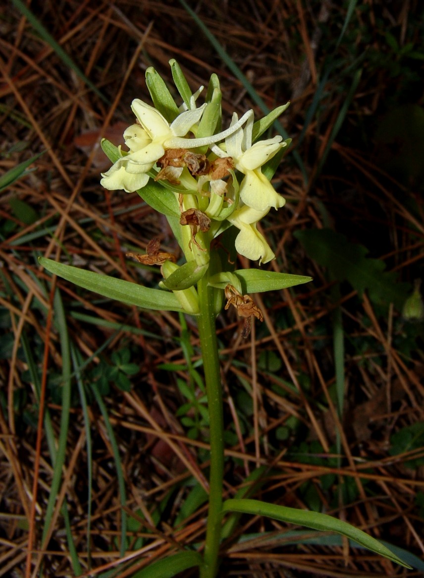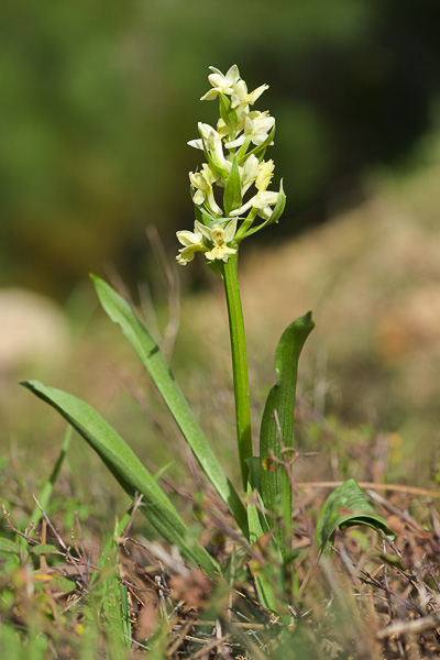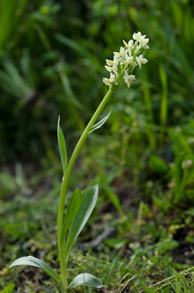 Blütenstand schmal zylindrisch, bis 20 cm lang, 40 - 80- blütig, Stängel mit 5 - 8 gelbgrüne Blättern, Blätter 13 - 31 cm lang, 1 - 3 cm breit, spitz zulaufend, aufrecht abstehend, mit Kapuzenspitze, ungefleckt, mehr als 4 mal so lang wie breit