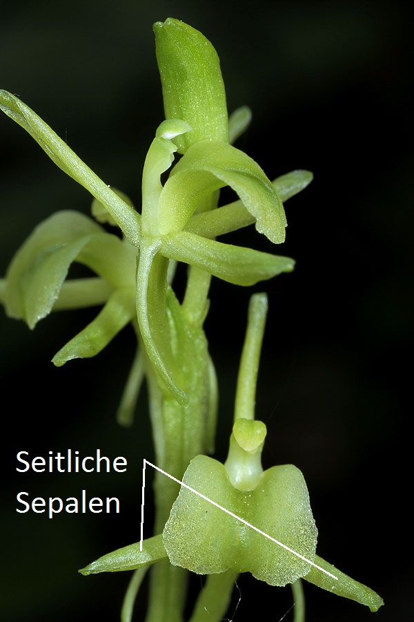 1 Seitliche Sepalen +/- parallel unter der Lippe