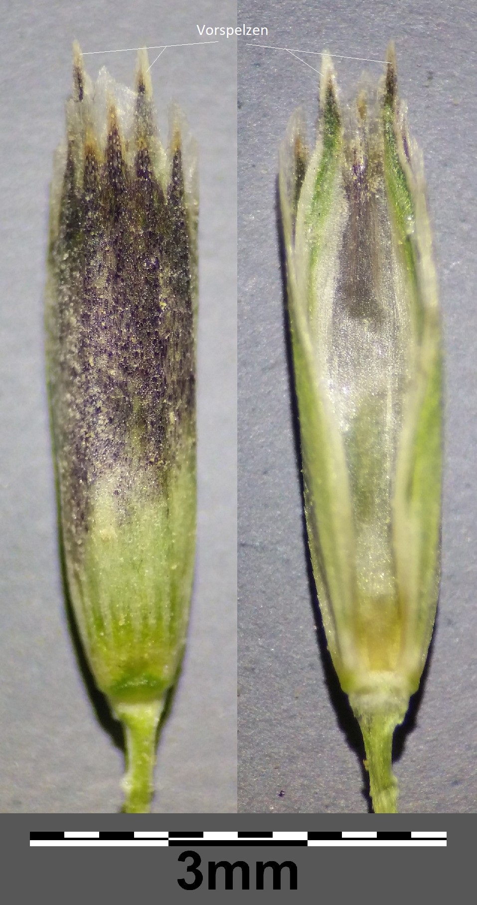 Deckspelze ca. 7 mm lang, vorne häutig, verschmälert, spitz oder schmal abgerundet, ganzrandig, 7- nervig, alle Nerven ca. gleich stark, Vorspelzen die Deckspelzen meist nicht überragend