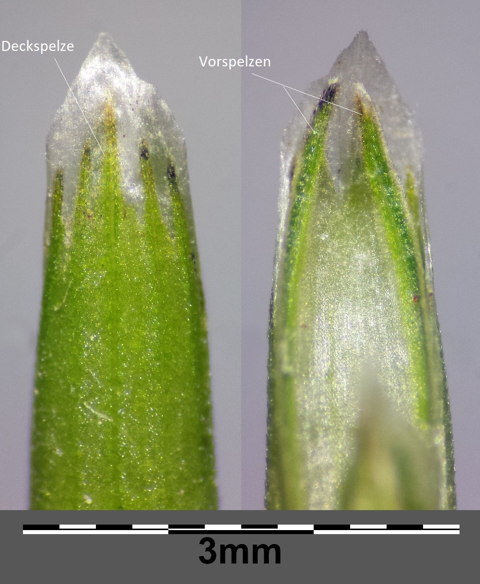 Deckspelze mit 3 kräftigen und 4 schwächeren Adern Vorspelzen die Deckspelzen nicht überragend > 2