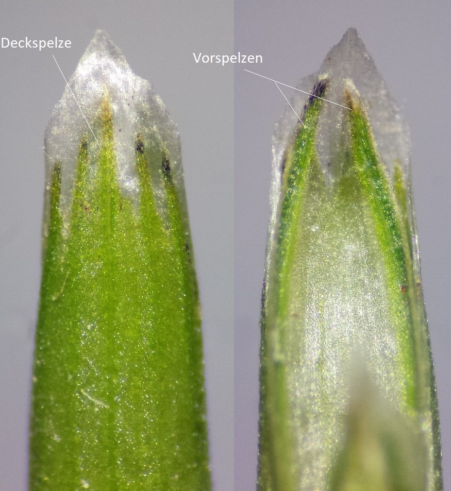 1 Deckspelze mit 7 kräftigen z.T. als Zahn austretenden Adern, Vorspelzen die Deckspelzen oft überragend