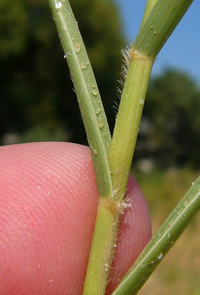 Rispen 3 - 5 cm lang, mit wenigen Ährchen, meist nur der untere Teil der Rispe von einem +/- bauchig aufgeblasenem Hüllblatt umgeben