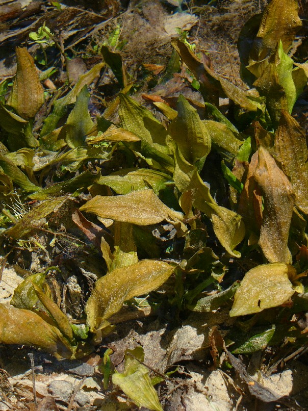 Schwimmblätter durchscheinend dünnhäutig (pergamentartig) eiförmig bis lanzettlich,meist rötlich gefärbt (an im Wasser schwimmende, verwelkte Blätter der Rotbuche erinnernd), mit deutlichen Quernerven