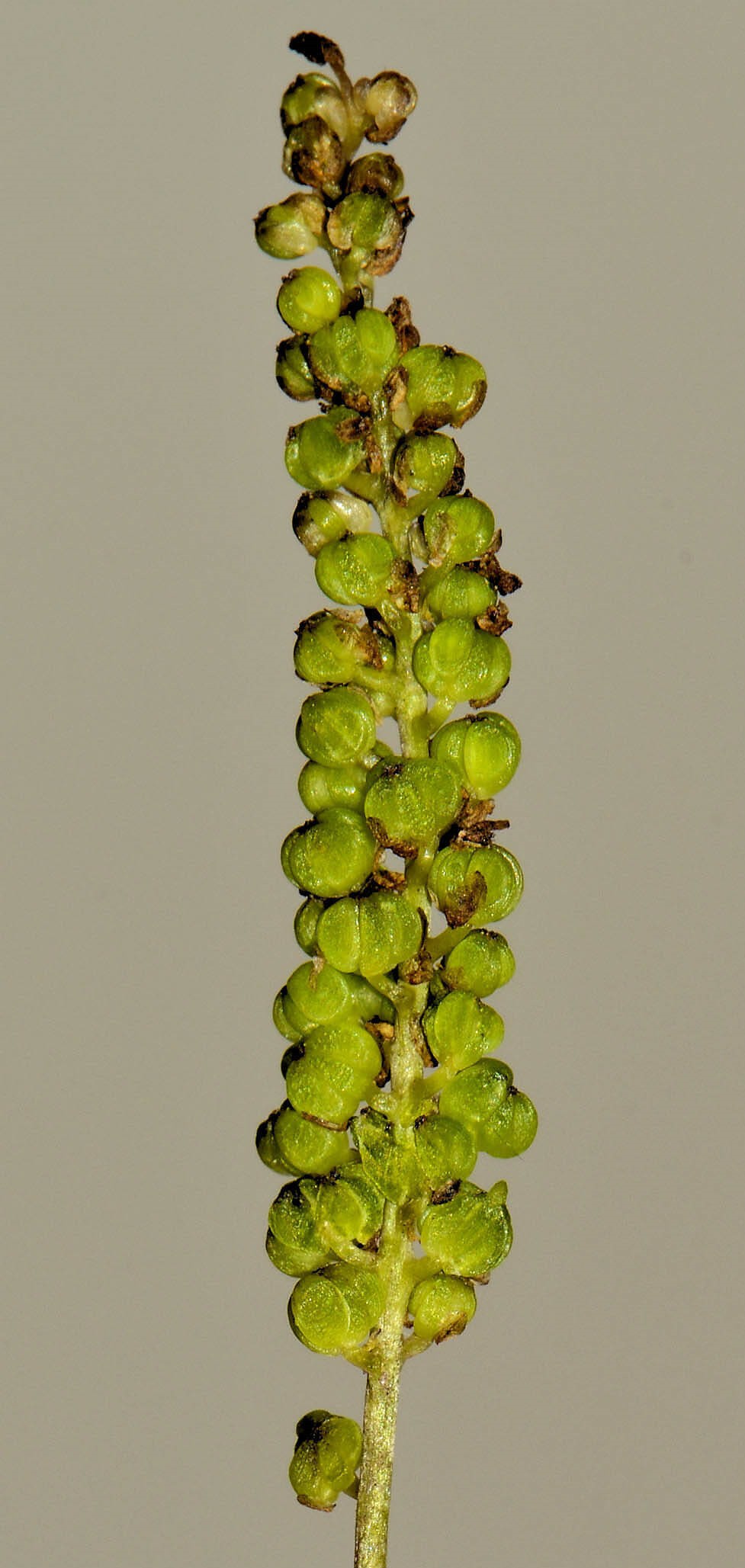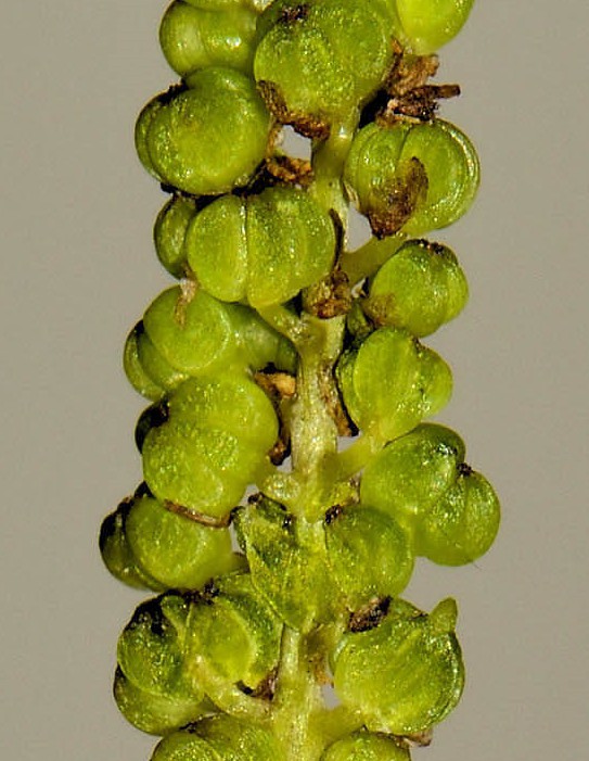 Früchte kugelig, 2 mm im Durchmesser, so breit wie lang, geflügelt, mit 3 sterilen und 3 fertilen Teifrüchten, Teilfrüchte am Rücken gerippt, Griffel sehr kurz, Fruchtstiele gewinkelt, nur 1,5 mm lang