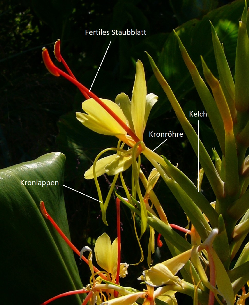 Blüten gelb, zygomorph, mit 3 Kronblättern, die an ihrer Basis zu einer langen, engen Röhre verwachsen sind und 3 linealischen Kronblattlappen, die nach dem Aufblühen zurückgebogen sind,