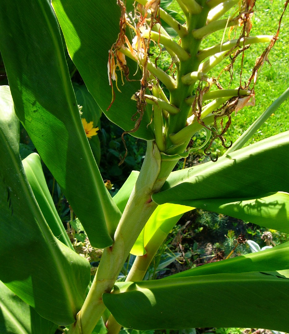 Blätter ähnlich der Bananenpflanze, schwach geöhrt, Blattspreite 20 - 45 cm lang, 10 - 15 cm breit, zugespitzt, Spitze oft umgebogen