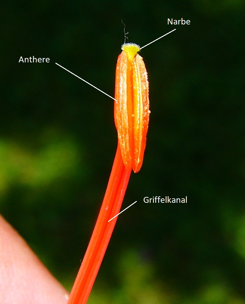 Nur 1 Staubblatt ist fertil, intensiv rot gefärbt und besteht aus Staubbeutel (= Anthere) und einem bis zu 6 cm langen Staubfaden, der eine Furche (= Griffelkanal) besitzt in der ich der sehr dünne Griffel befindet, an deren Spitze sich die Narbe befindet