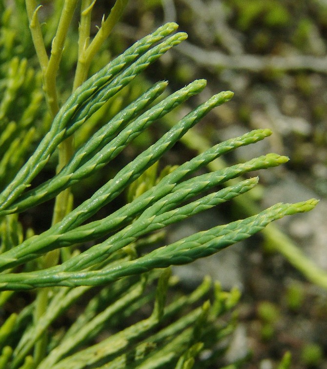 Sprosse abgeflacht, unbereift, mit langen fächerförmigen auseinander laufenden Endverzweigungen, Spitze der Seitenblätter meist deutlich abstehend, Blätter der Sprossunterseite sehr klein