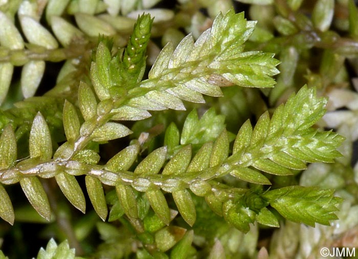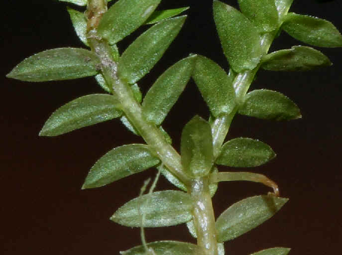 Laubblätter eiförmig, max. 3 mm groß, mit breiter, stumpflicher Spitze, gegenständig, 4-reihig, in einer Ebene angeordnet, Verzweigungen nicht gelenkartig