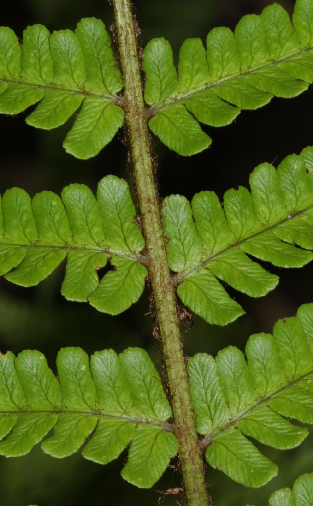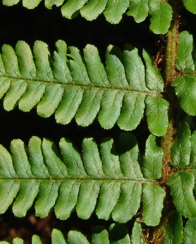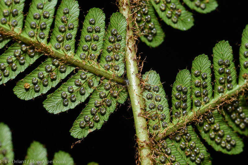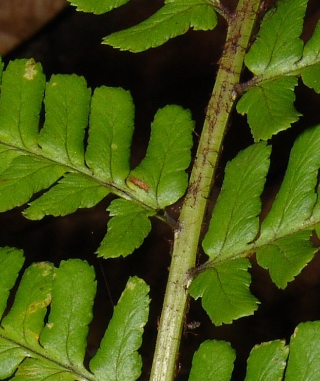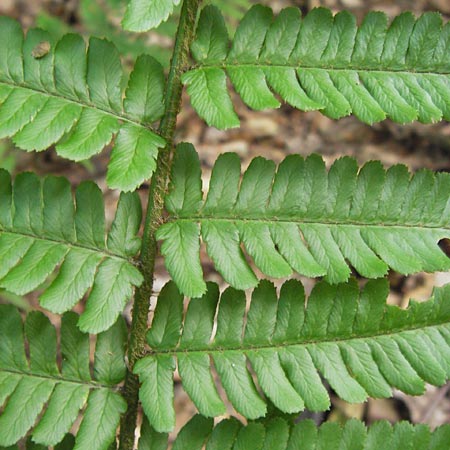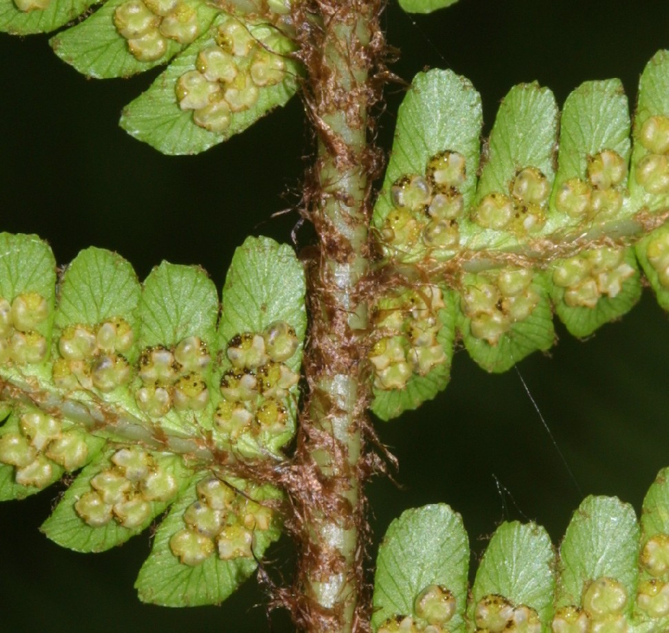2 Spreuschuppen braun, besonders an der Blattspindel mit schwarzbraunem Grund, Fiederabschnitte mit kurzen, nicht abspreizenden Zähnen