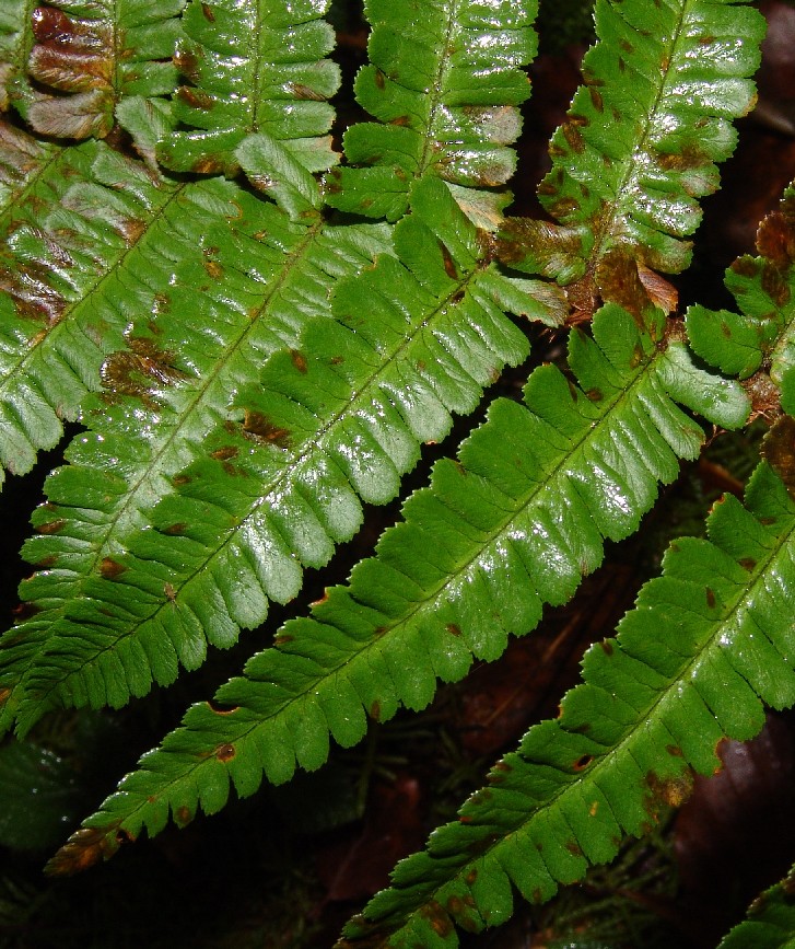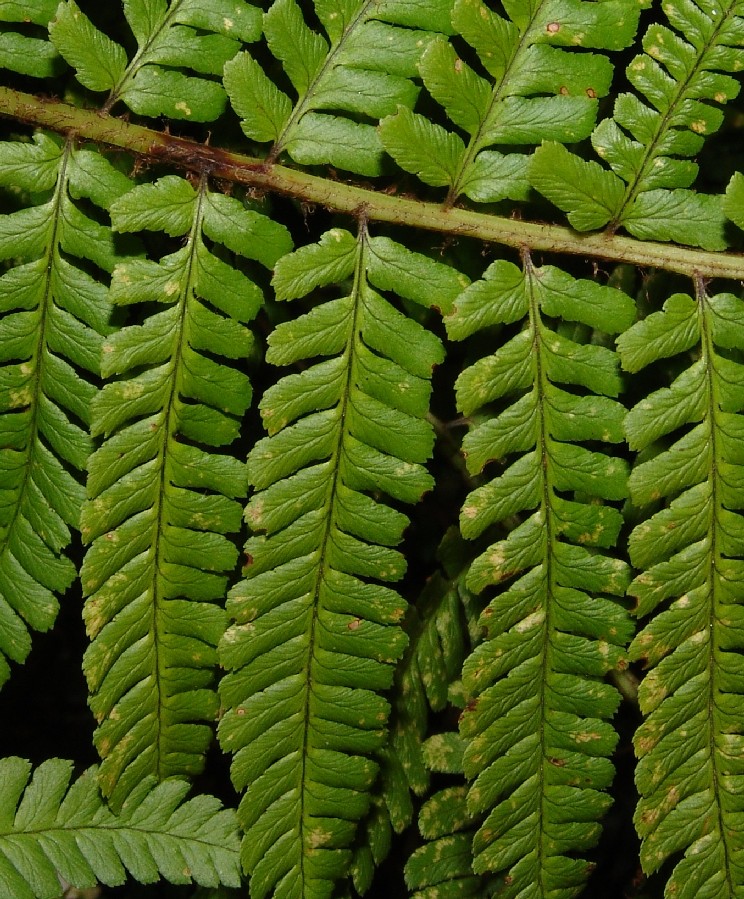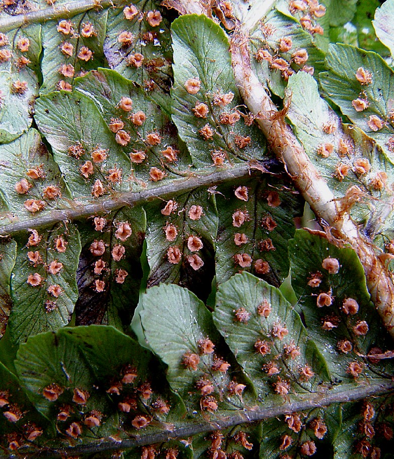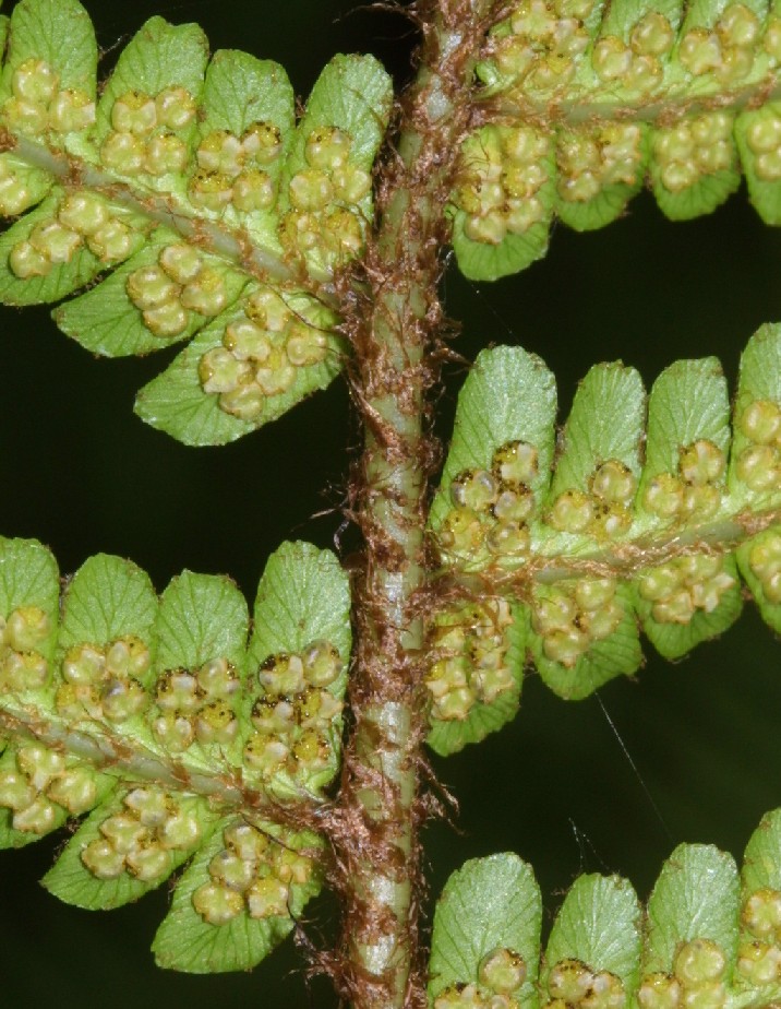 2 Spreuschuppen braun, besonders an der Blattspindel mit schwarzbraunem Grund, Fiederabschnitte mit kurzen, nicht abspreizenden Zähnen