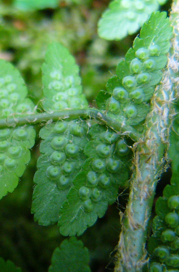 Pflanze 30 - 50 cm groß Sori kugelig, ohne breiten farblosen Rand, vom Blättchen abgehoben Schleier dick und unter den Sorus greifend, nicht einschrumpfend seltene Art > 2