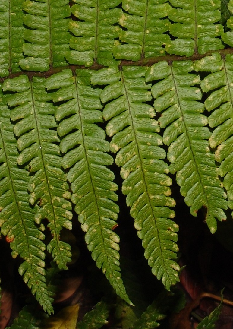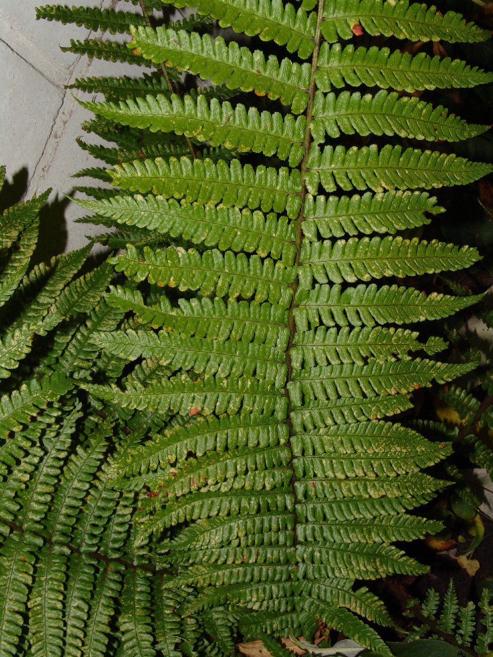 Pflanze 80 - 140 cm groß Blattspreite glänzend und dick, Zähne der Fiederchen lang, breit, unregelmäßig groß Spreuschuppen schwarz,