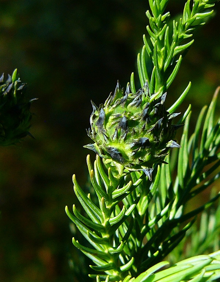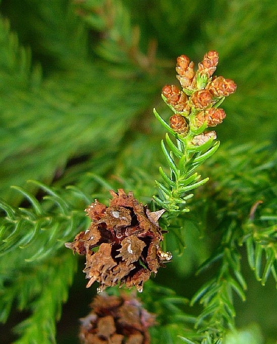 Pflanze einhäusig getrenntgeschlechtlich: links unten: verholzter weiblicher Zapfen,