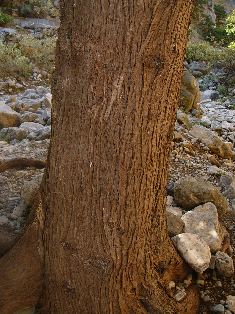 Borke grau oder rötlichbraun, faserig, mit Längsstruktur