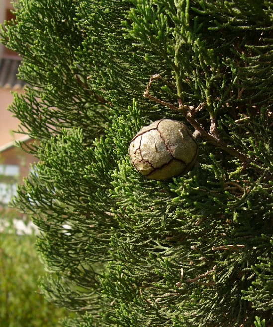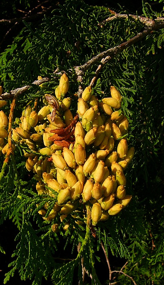 Zapfen bläulichgrün, mit langen Dornen, > Platycladus orientalis