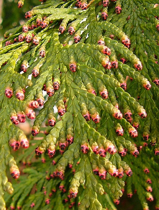 Blüten ein- oder zweihäusig getrenntgeschlechtlich in Zapfen: Männliche Zapfen +/- eiförmig, am Zweigende stehend