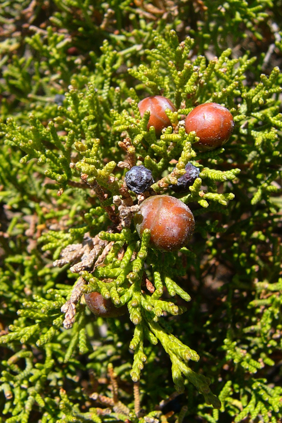 Juniperus - Blätter alle oder teilweise schuppenförmig, Schuppenblätter mit Hautrand, Zapfen braunrot