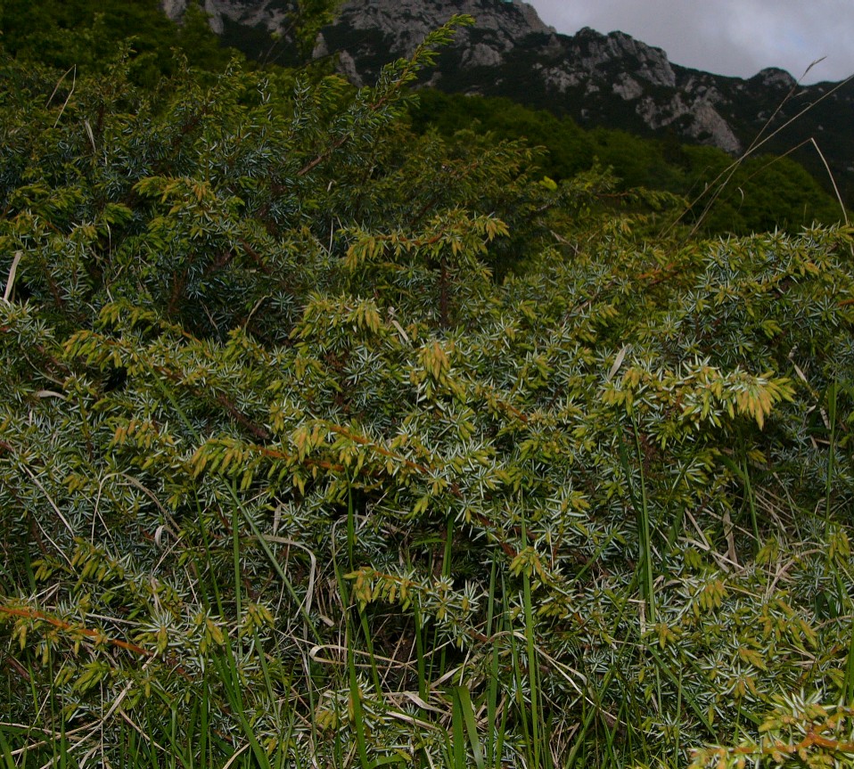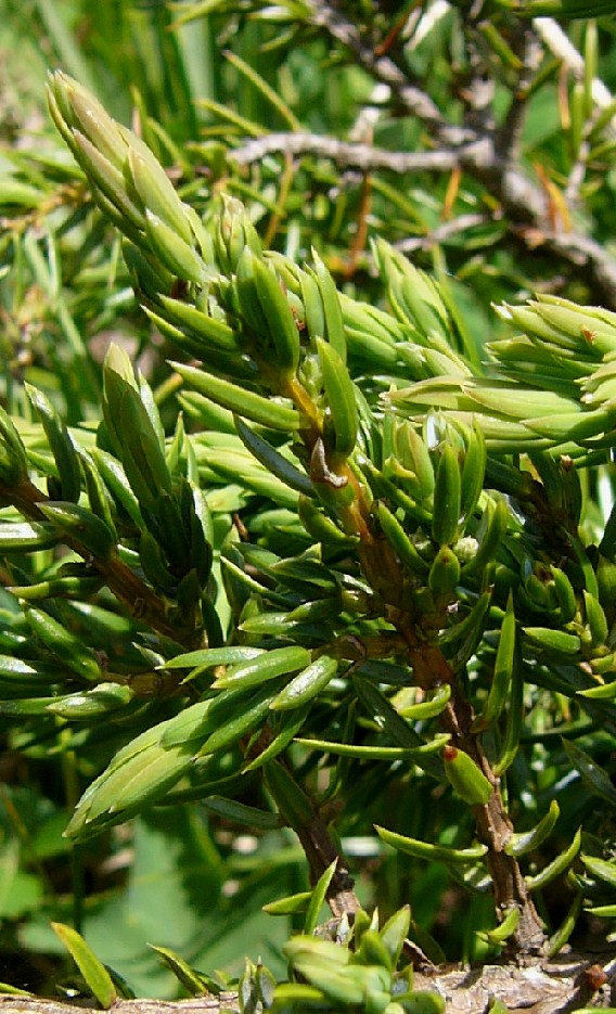| Niederliegender bis 80 cm hoher Strauch Nadeln nach oben gebogen, 4 - 8 mm lang, wenig stechend > 1