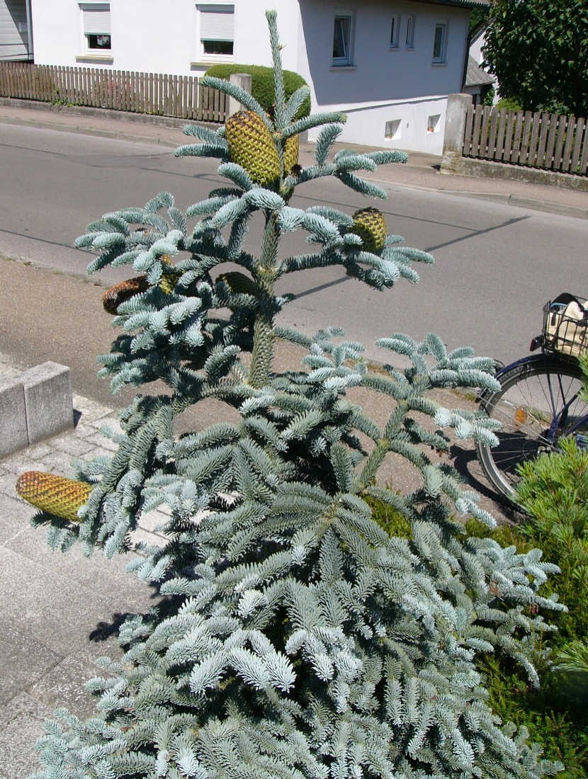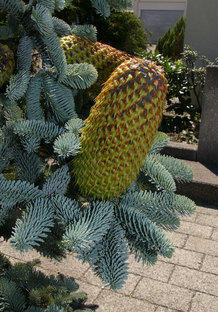 Zapfen gehäuft an der Baumspitze, 8-14 cm lang, erst blaugrün, später trüb-violett, bleiben am Baum und fallen nicht herunter, Fruchtreife: VIII - IX