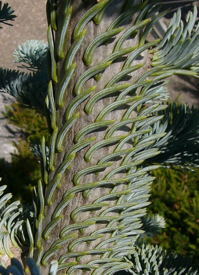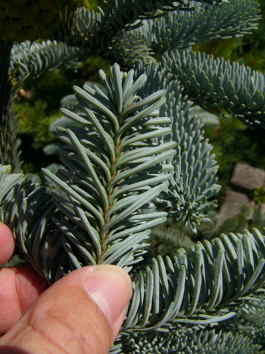 Nadeln blaugrün, sehr dicht stehend, die Zweigoberseite verdeckend