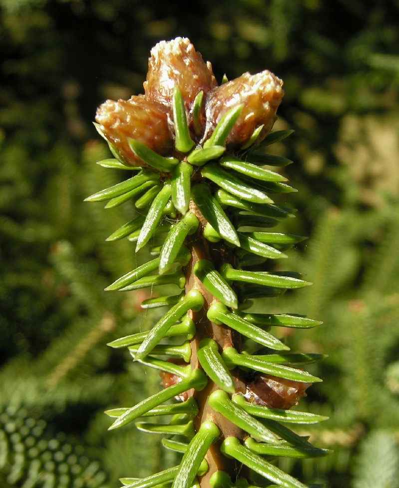 Nadeln dicht und fast gleichmäßig nach allen Seiten rechtwinklig abstehend, stumpf, fast 4- eckig, auf beiden Seiten mit Spaltöffnungsbändern, 1 - 2 cm lang