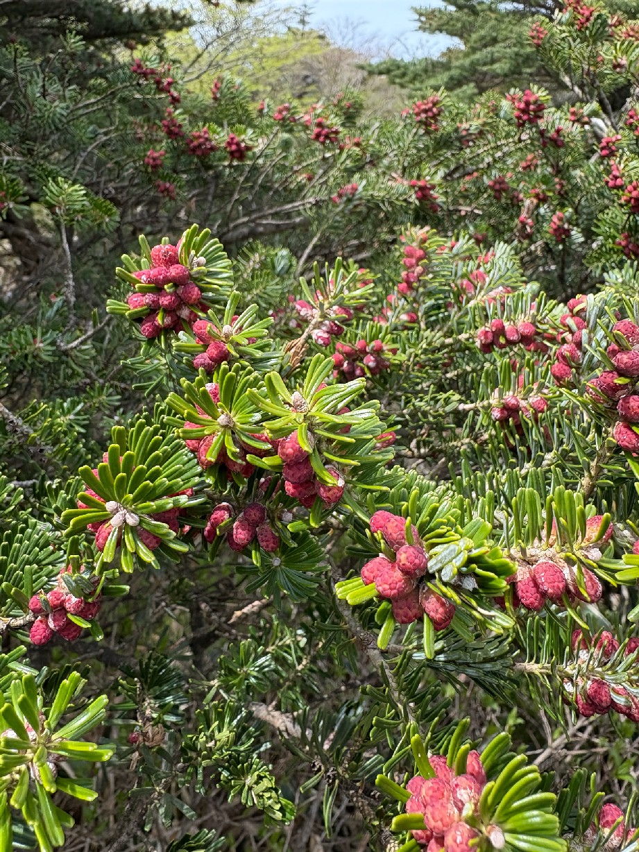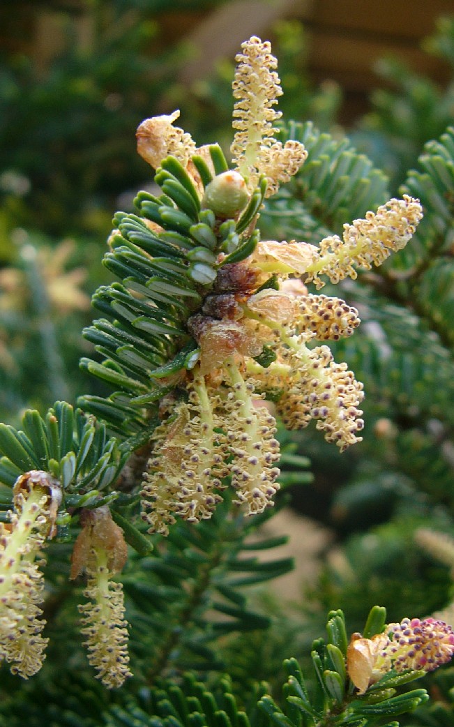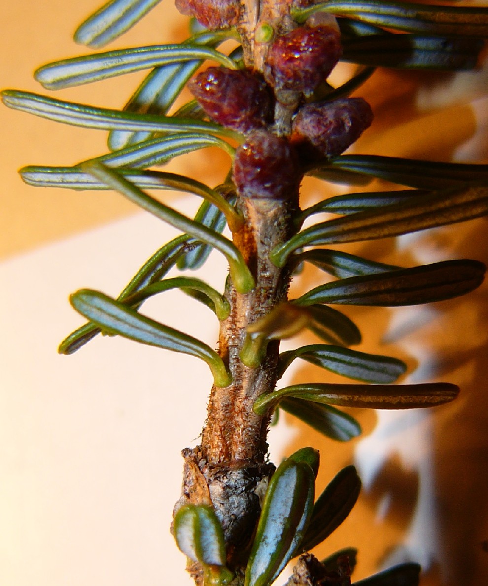 Junge weibliche Zapfen meist violett oder rosa, mit weit herausragenden Deckschuppen