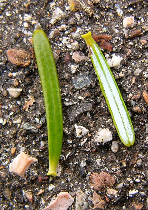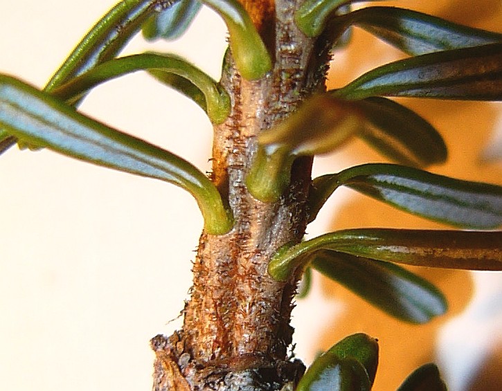 Nadeln fast rings um den Trieb gestellt, kurz ( 1,5 - 2 cm), oberseits grün