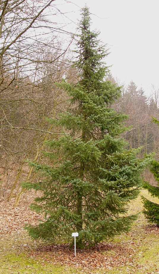 40 - 50 m hoher Baum, mit ebenmäßiger, schmal kegelförmiger Krone, Stamm bis dicht zum Boden beastet, Äste waagrecht oder aufstrebend, an der Spitze leicht aufwärts gerichtet; Häufig werden goldfarbene Sorten z.B. 'Early Gold' gepflanzt