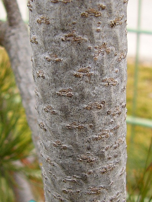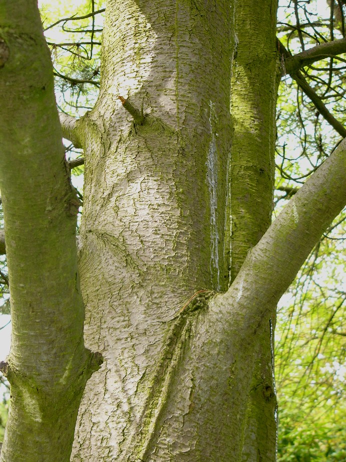Borke bei älteren Bäumen rissig, aschgrau, bedeckt von kleinen silbergrau glänzenden Schuppen