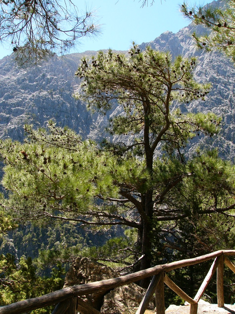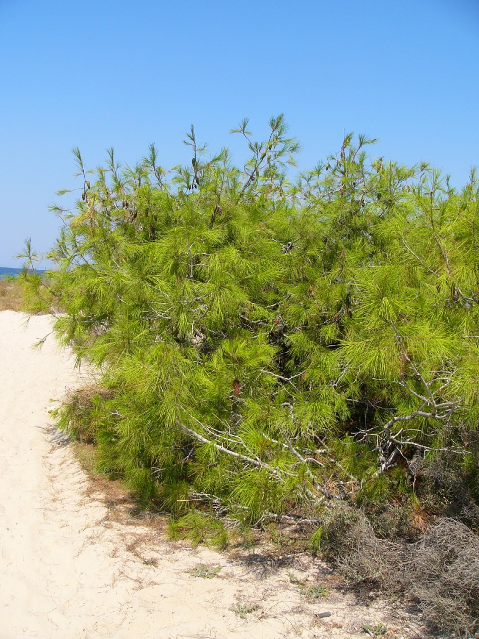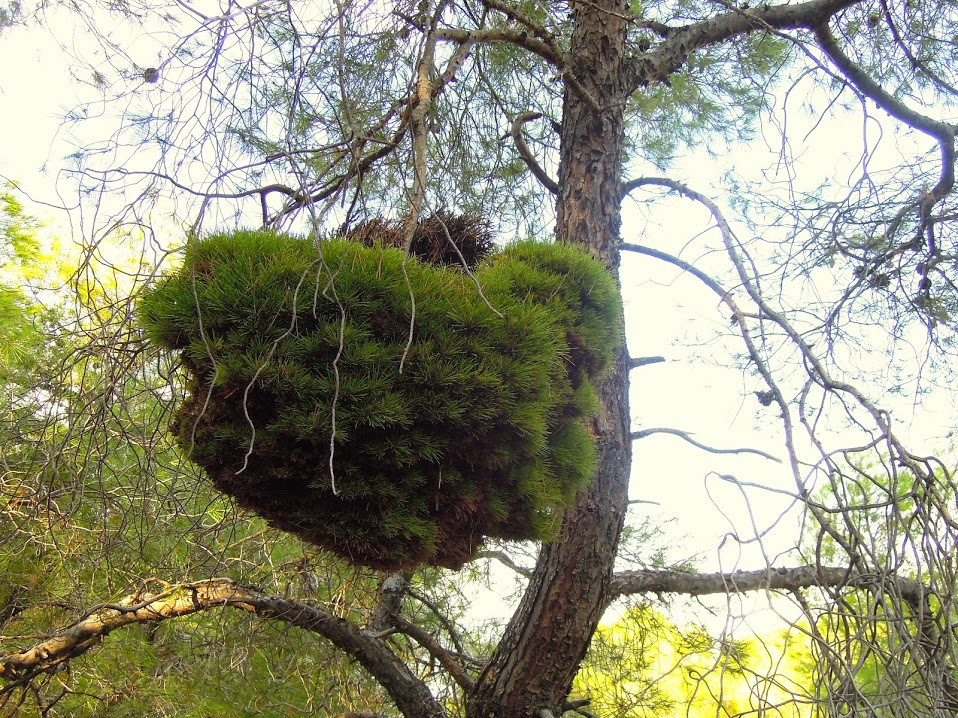 in: Etymologie: Die Aleppo- Kiefer ist im Mittelmeerraum weit verbreitet und wächst sowohl in Strandnähe als auch in höheren Lagen (Peloponnes bis 1.000 Meter, Chalkidiki bis 650 m). Die bei Kiefern z.B. Pinus halepensis auftretenden "Hexenbesen" (= kugelige und buschige Verwachsungen in Baumkronen) werden durch Knospenmutationen verursacht, die zur Bildung zahlreicher dünner und kurzer Zweige führt.