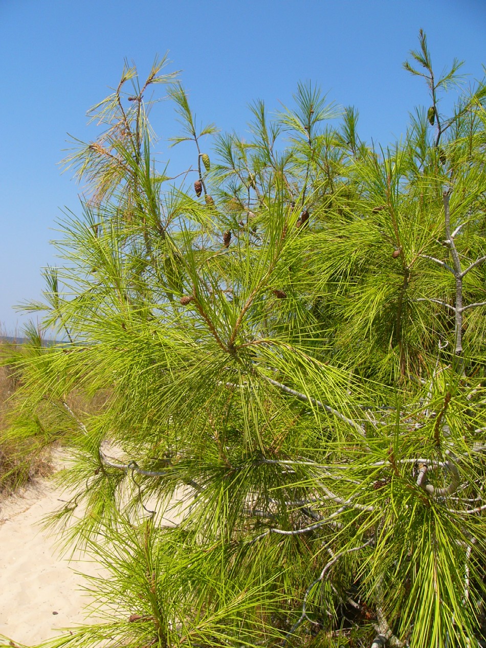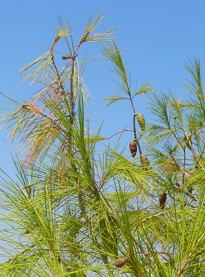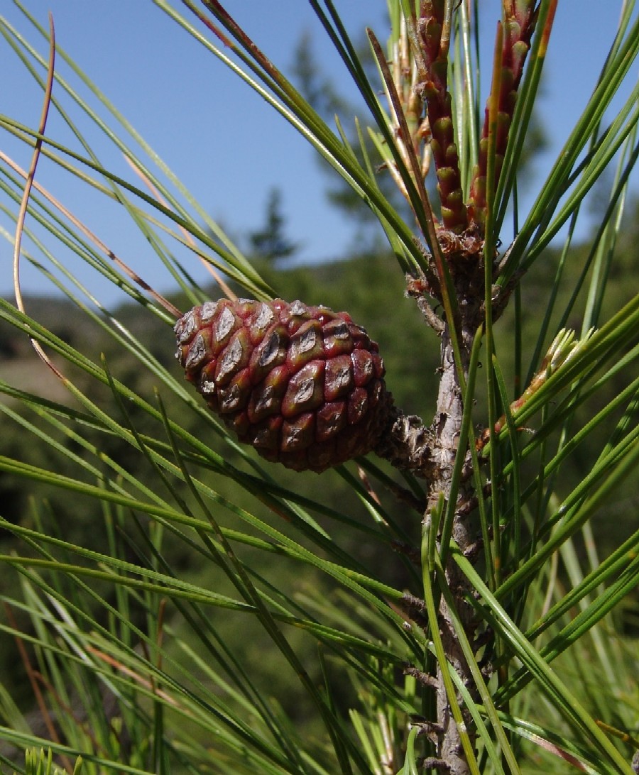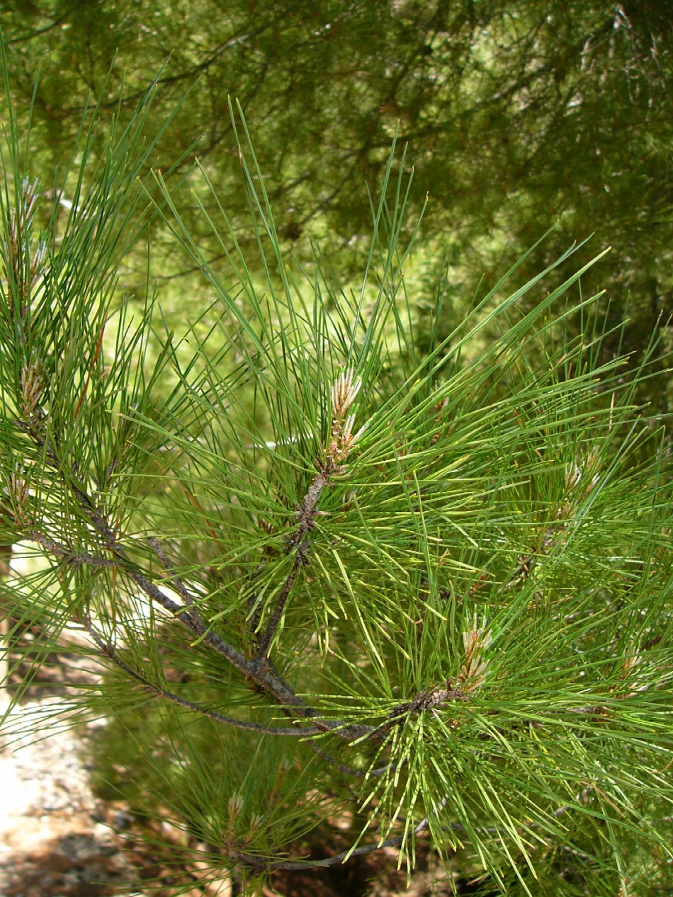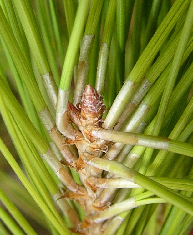 Knospen 0,5 - 1,5 cm lang, harzlos, zylindrisch, Schuppen an der Spitze lockig eingerollt Nadeln hellgrün, 11 - 16 cm lang, zu 2, gerade