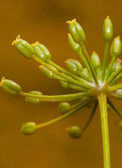 zusammengedrückt, kaum gerippt Dolden mit bis zu 50 Doldenstrahlen, Doldenstrahlen schlank, +/- gleich lang > Ridolfia (Ackerfenchel)