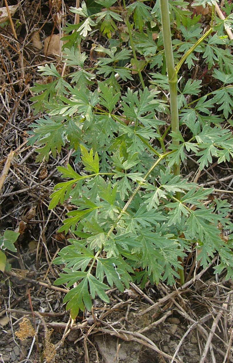 gerippt Blattachse knickig gebogen, Endabschnitte der Blätter ledrig, keilig, 3 - 5- spitzig > Oreoselinum nigrum (Berg- Haarstrang)