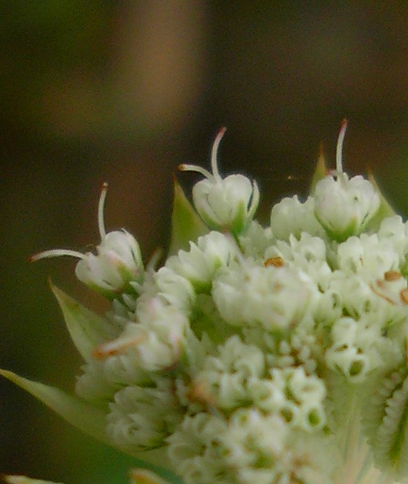 Döldchen mit 10 - 15 Hüllblättchen, die länger als die Döldchen sind, Hüllblättchen 10 - 21 mm lang, 2 - 4 mm breit, rosa- weißlich, mit grünen Mittelrippen und deutlichen Quernerven