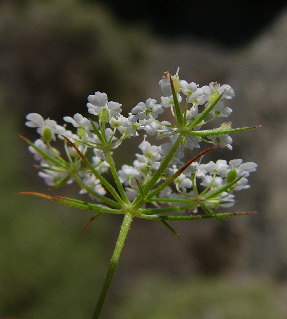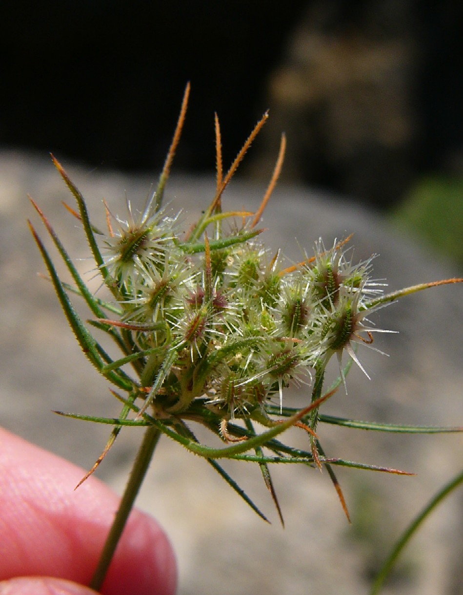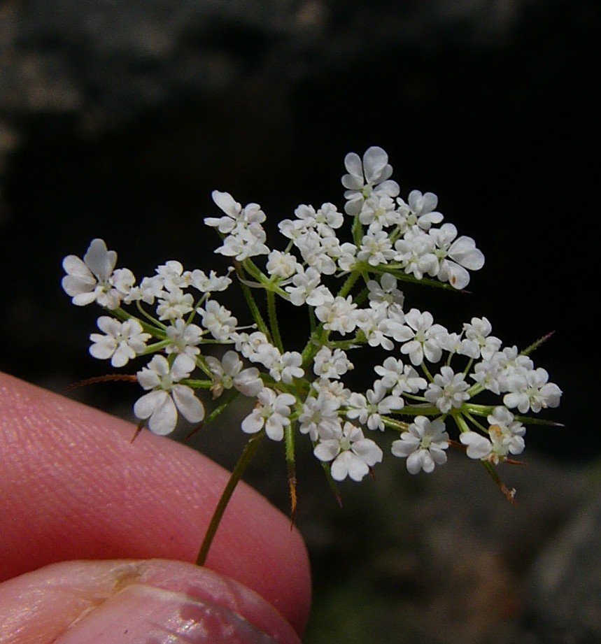 Stängel undeutlich gefurcht, schwach rückwärts behaart bis fast kahl Dolde locker, mit 5 - 8 Strahlen, flach, randständige Kronblätter vergrößert, im Zentrum manchmal mit großer schwarzpurpurner steriler Blüte Hüllblätter kürzer oder so lang wie als die Dolde, 3- teilig oder gefiedert, Endabschnitte linealisch, Hüllchenblätter pfriemlich, spitz Stacheln auf den Früchten deutlich länger als die Breite der Frucht Stacheln auf den Früchten am Grund verbreitert und zu einem Kamm zusammenlaufend