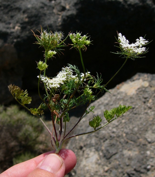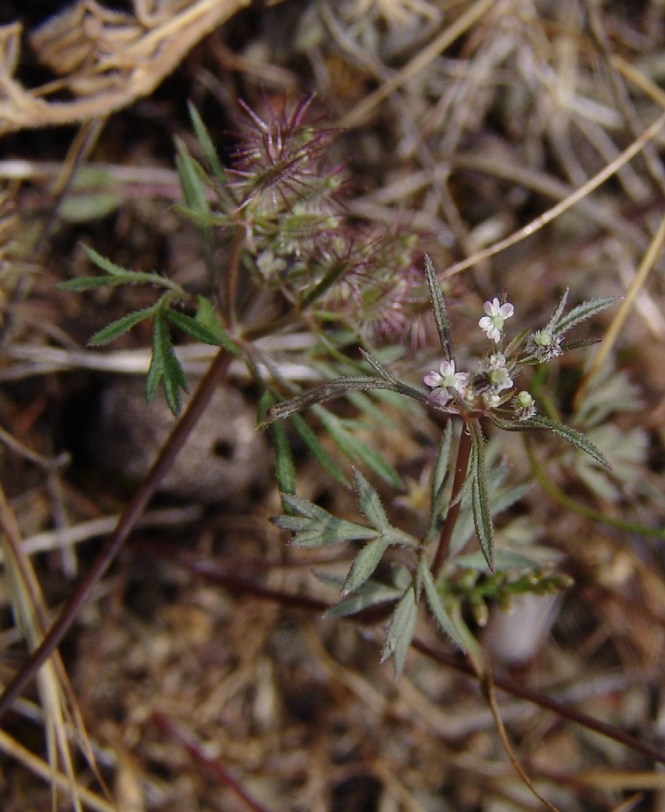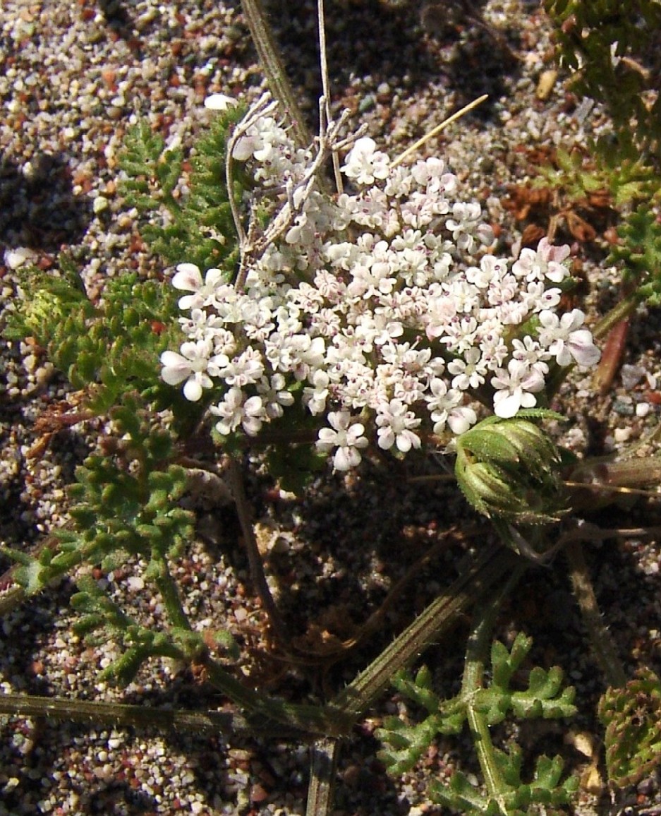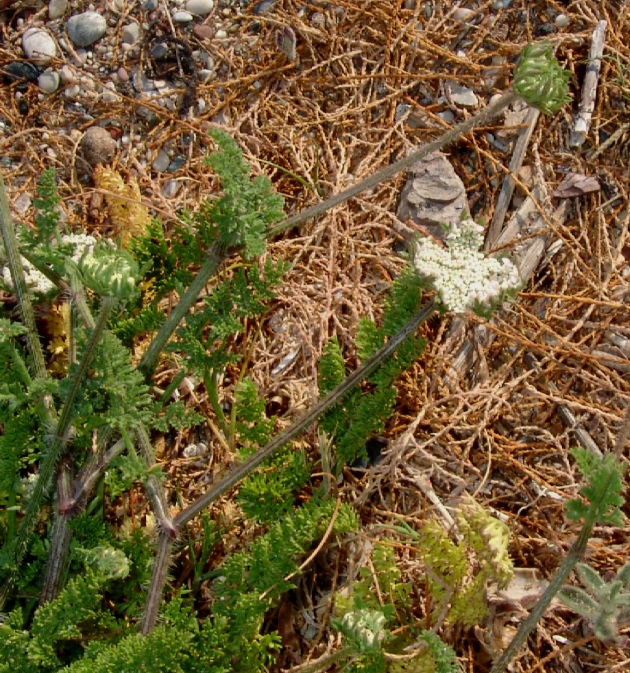 Stängel undeutlich gefurcht, schwach rückwärts behaart bis fast kahl Dolde locker, mit 5 - 8 Strahlen, flach, randständige Kronblätter vergrößert, im Zentrum manchmal mit großer schwarzpurpurner steriler Blüte Hüllblätter kürzer oder so lang wie als die Dolde, 3- teilig oder gefiedert, Endabschnitte linealisch, Hüllchenblätter pfriemlich, spitz Stacheln auf den Früchten deutlich länger als die Breite der Frucht Stacheln auf den Früchten am Grund verbreitert und zu einem Kamm zusammenlaufend