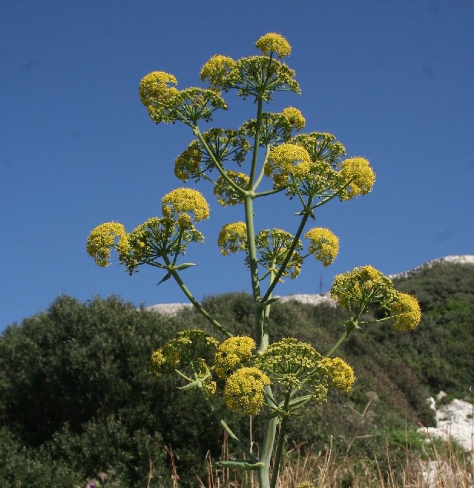 kurzen Doldenstrahlen Blattscheide der oberen Blätter auffällig groß, die jungen Dolden einhüllend > Ferula tingitana