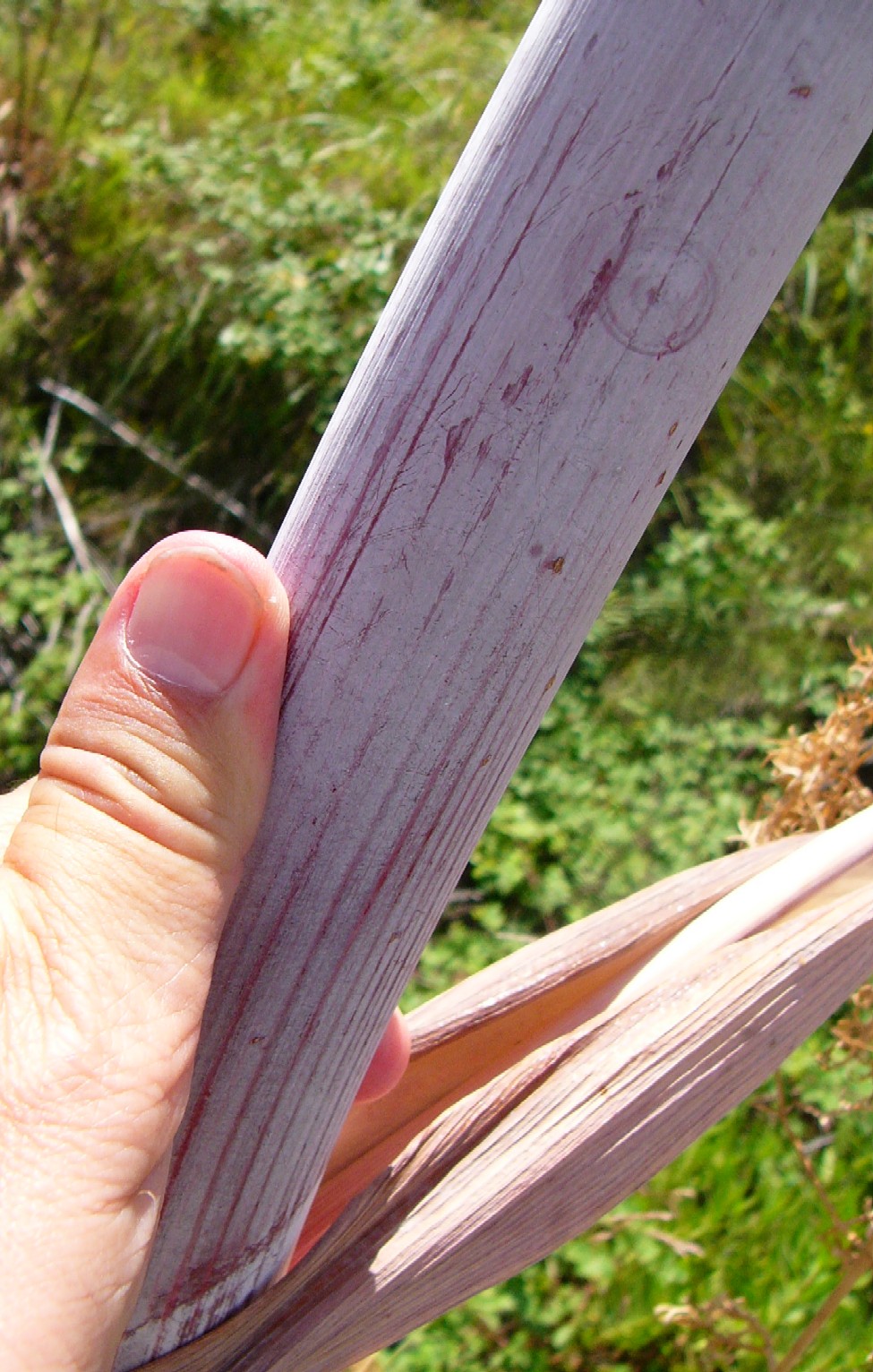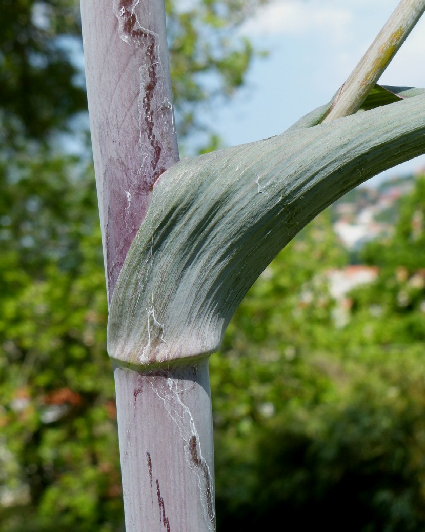 Seitenäste entspringen einer bauchig aufgeblasener Blattscheide, mit mehreren Enddolden