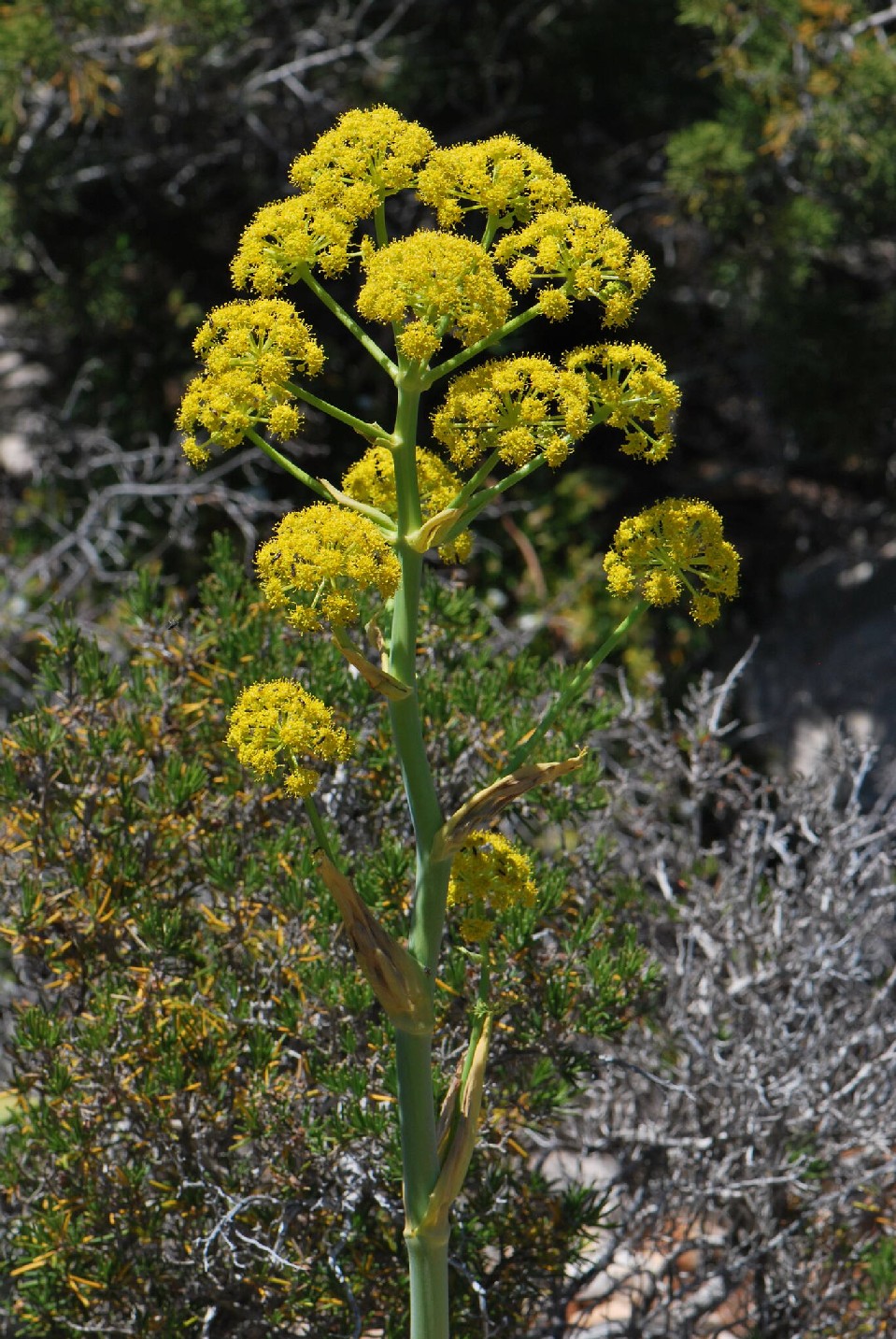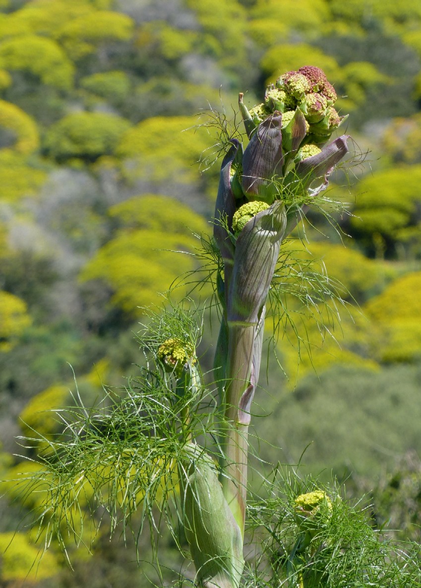 1 Endemit in Sardinien und Korsika, Pflanze 70 - 150 cm groß, Blütenstand zylindrisch, seitliche Doldenstiele 4 - 6 cm lang