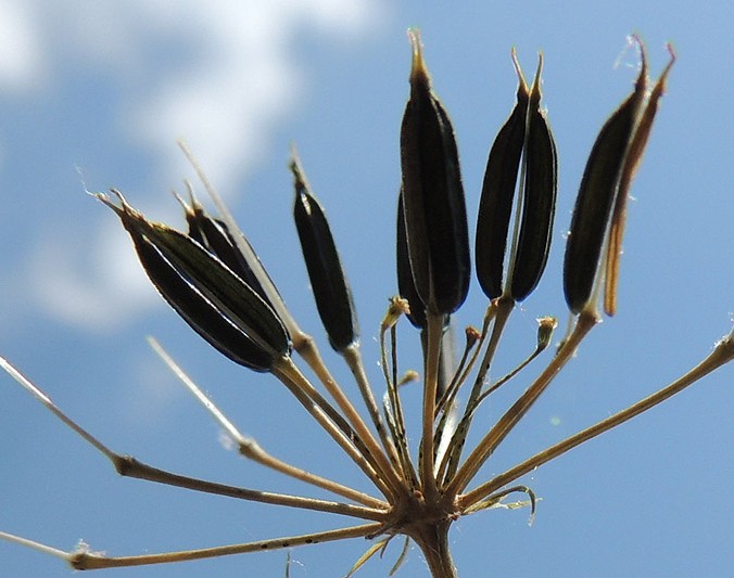 Früchte 3 - 6 mm lang, länglich- eiförmig, 2 mal so lang wie breit, mit deutlichen seitlichen Rippen, Griffel aufrecht oder etwas spreizend