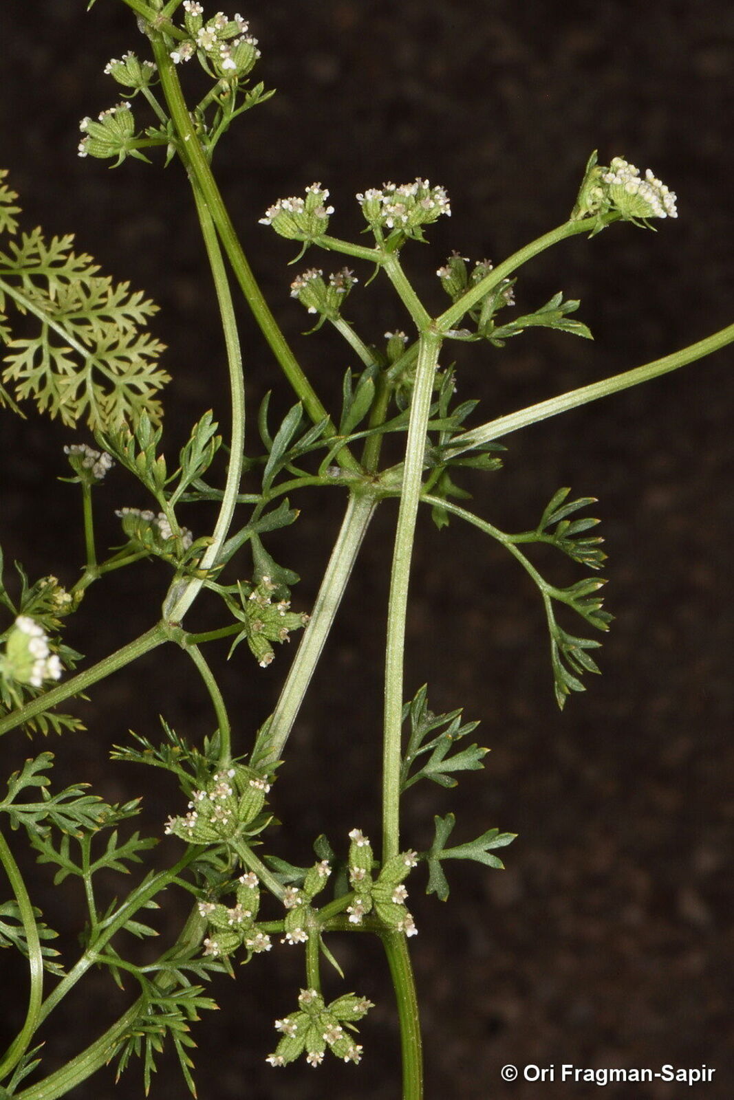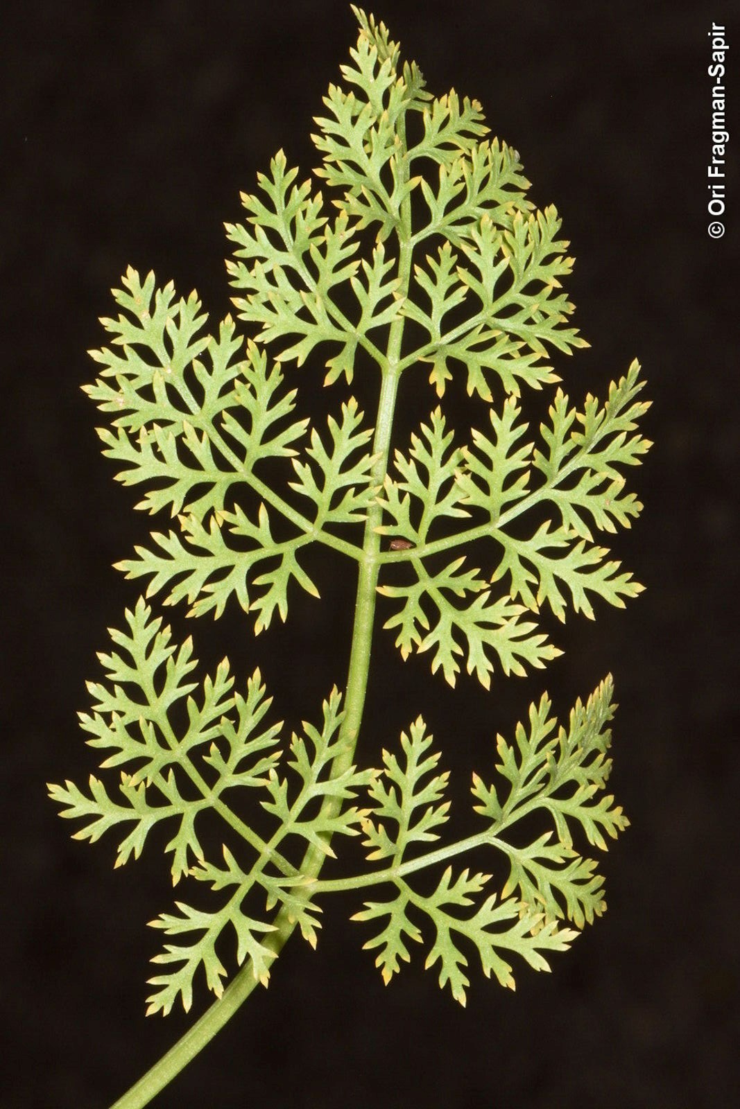 Grundblätter 3 - 4- fach gefiedert, 30 - 150 mm lang, 20 - 20 mm breit, im Umriss dreieckig, ähnlich den Blätter von Fumaria (Erdrauch), Endabschnitte 2 - 3 mm lang, 1 mm breit, spitz