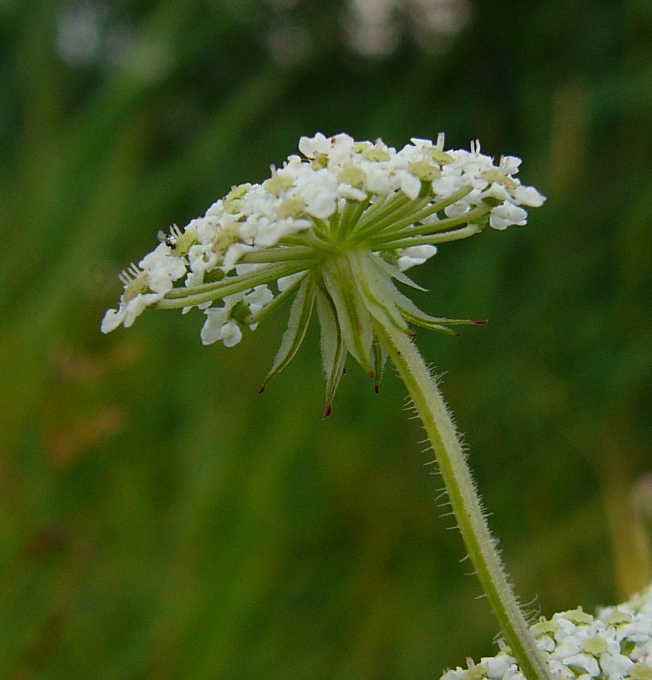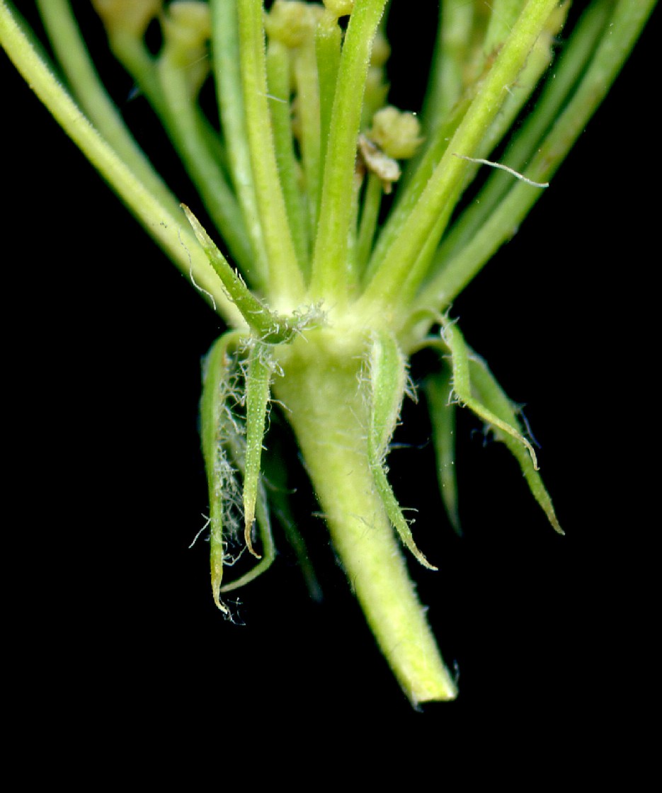 Dolde mit vielen lanzettlichen, am Rand membranösen Hüllblättern, bald nach unten geschlagen, Doldenstrahlen innen rau
