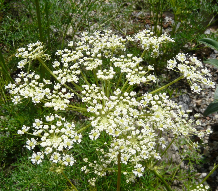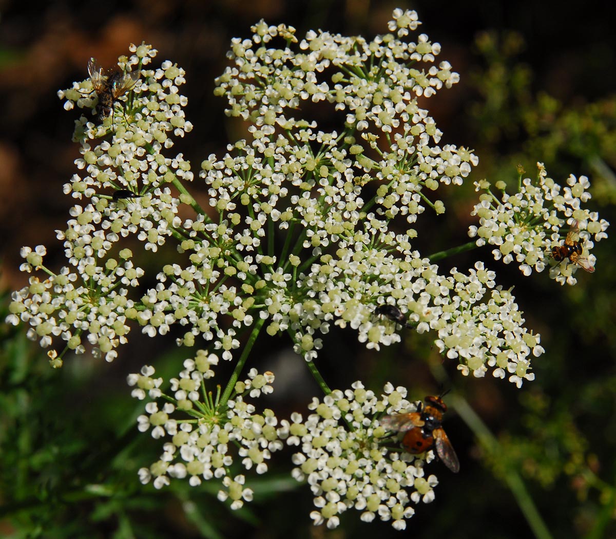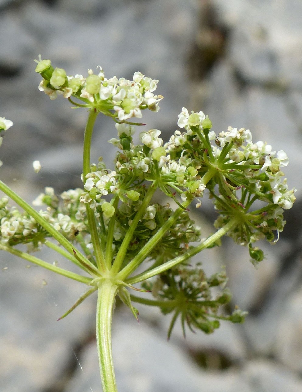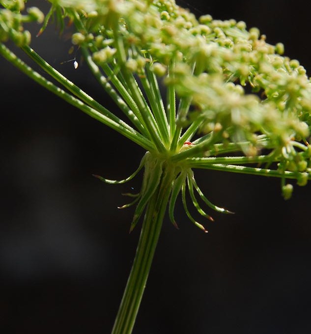 Dolden mit 15 - 40 Doldenstrahlen und zahlreichen Hüllblättern, Döldchen mit mit mehreren linealischen Hüllchenblättern, Hüllblätter ungeteilt, ganzrandig, lanzettlich, zur Blütezeit bereits zurückgeschlagen, Doldenstrahlen innen rau, zur Fruchtzeit 3 - 10 cm lang
