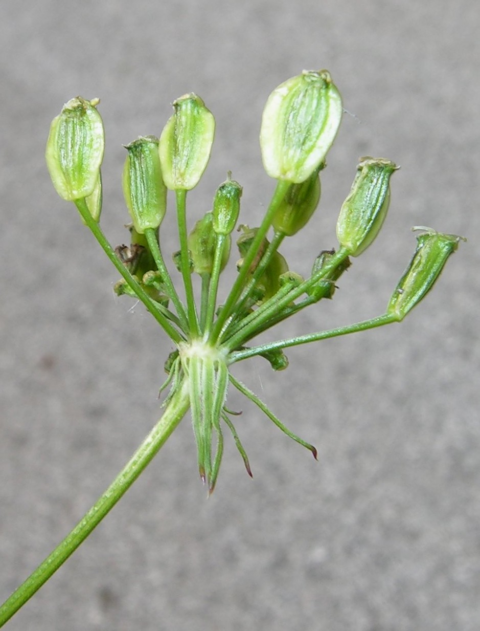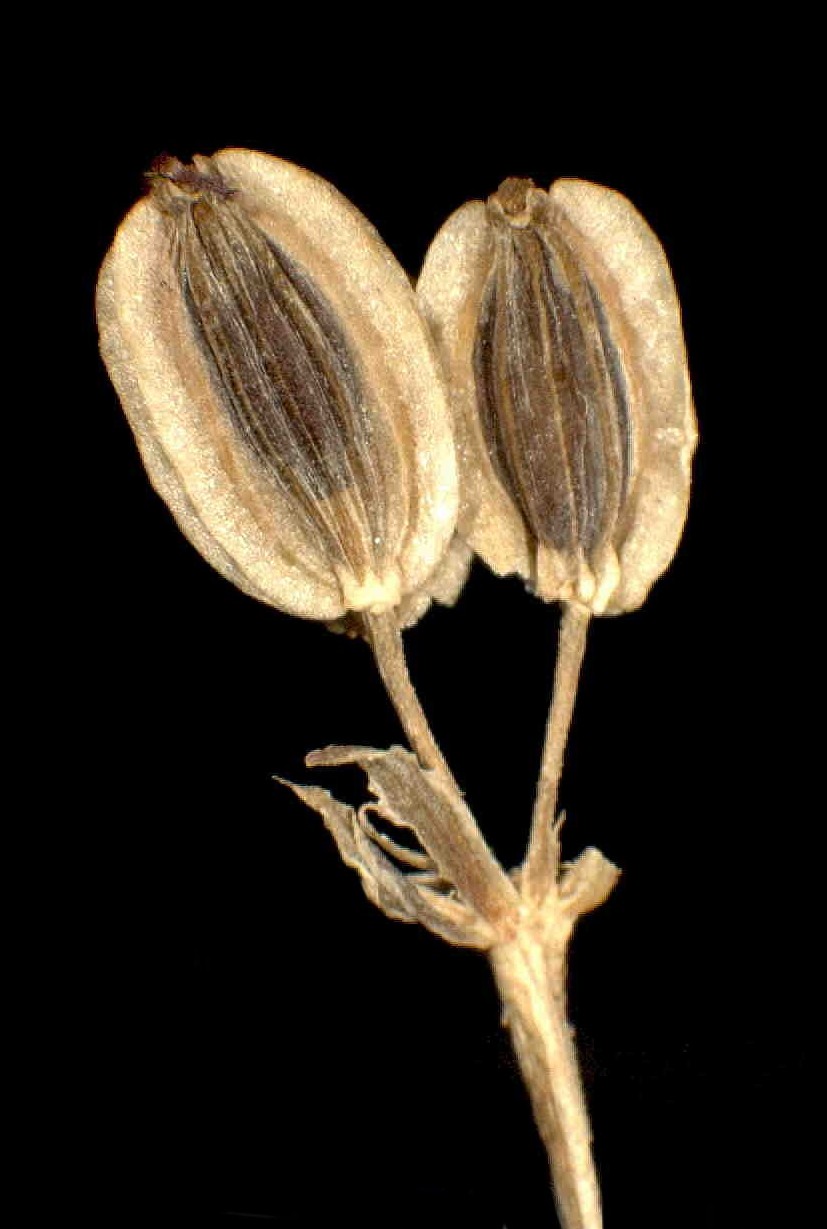 Reife Früchte eirundlich, 6 - 9 mm im Durchmesser, flach, mit breit geflügelten Randrippen. Griffel 1,5-3 mm lang, Kelchzähne vorhanden, eilanzettlich, spitz